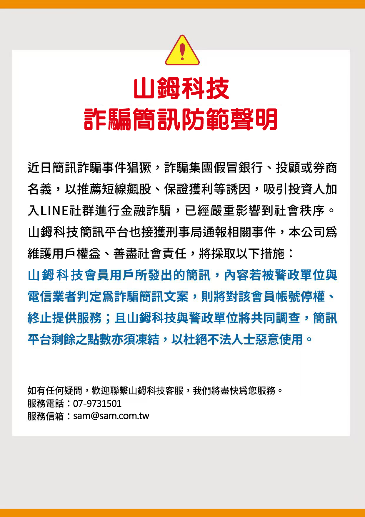 山鉧科技簡訊平台也接獲刑事局通報相關事件,本公司維護用戶權盆、善盡社會责任,